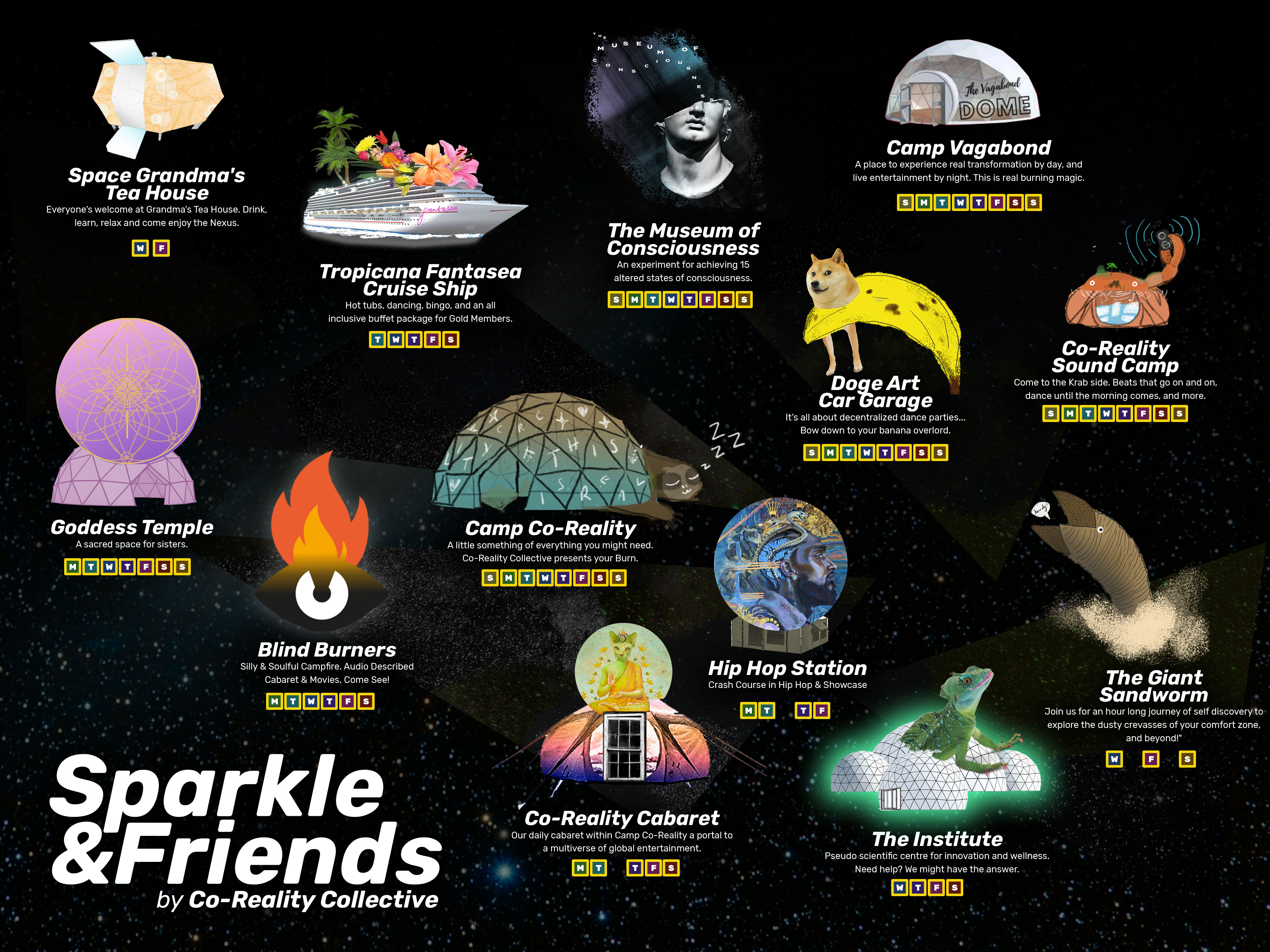 I created illustrated clickable maps as well as video content for Co-Reality Parties as well as SparkleVerse, one of the recognized universes for the Burning Man 2020 and 2021 Online Burn.